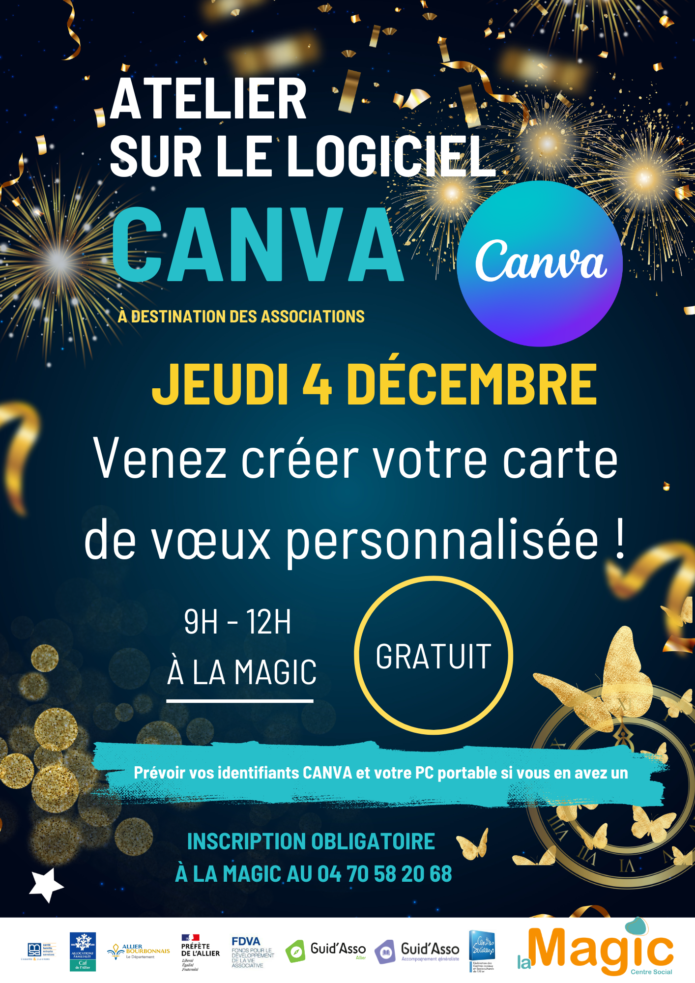 À l'approche de la fin d'année La MAGIC propose un atelier "création carte de vœux" avec le logiciel CANVA : JEUDI 4 DÉCEMBRE à La MAGIC, de 9h à 12h.
