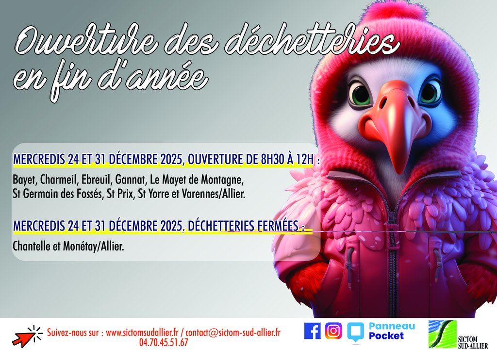 Le SICTOM vous informe que la déchetterie de Chantelle sera fermée les mercredis 24 et 31 décembre 2025.