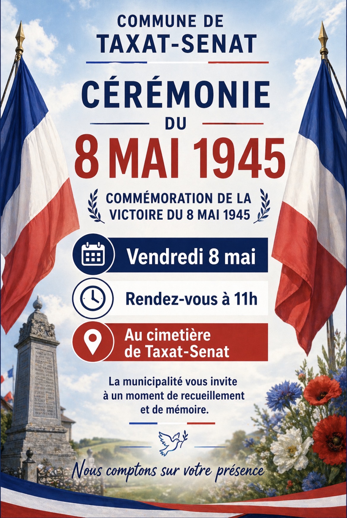 Le Conseil Municipal vous invite à la commémoration du 8 mai à 11 h au cimetière de Taxat-Senat.